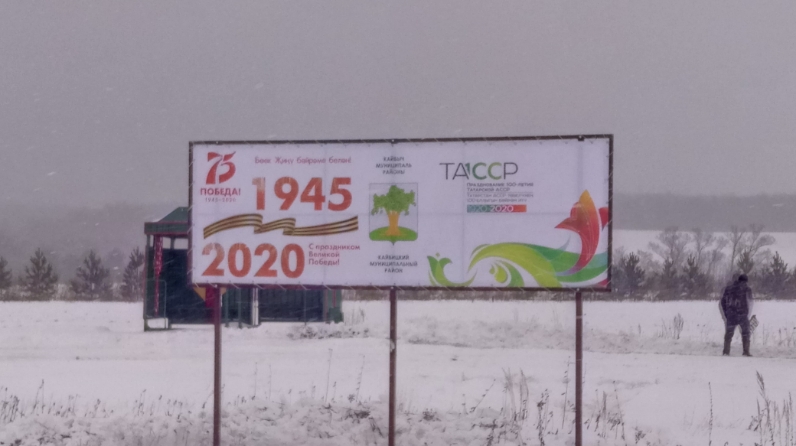 ТАССРның 100 еллыгына һәм Бөек Җиңүнең 75 еллыгына багышланган логотиплар белән баннер урнаштырылды Камыллы авылы янында.